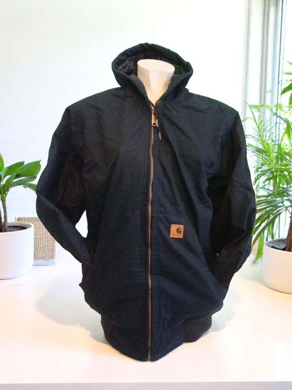 Giacca Carhartt nera, in robusto canvas con cappuccio e zip frontale. Logo Carhartt applicato sulla tasca e dettagli originali su zip e cuciture. Taglia XL, vestibilità comoda. Capo resistente e iconico, ideale per look streetwear, outdoor o workwear.
